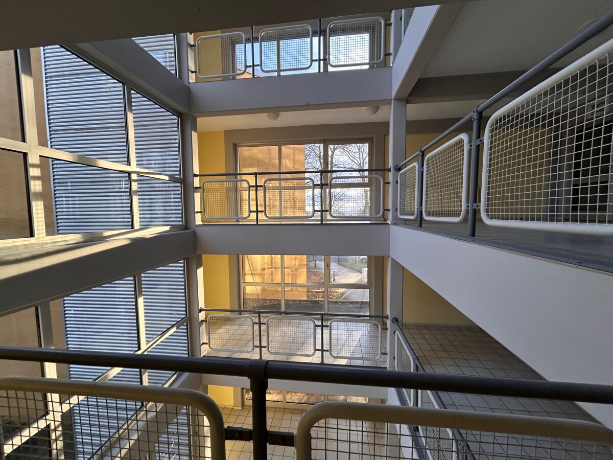 Zur Wohnung gehört eine Küchenzeile, ein kleiner französischer Balkon, ein separater Kellerraum und ein eigener Pkw-Stellplatz. Ein großzügiges, helles Treppenhaus, zentrale Postfach- und Türsprechanlage sowie eine gepflegte Außenanlage sind vorhanden.