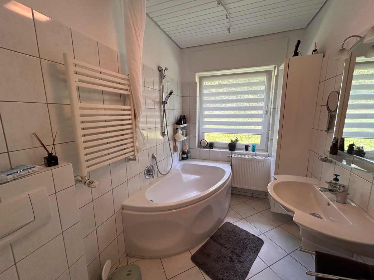 Das Haus wird über eine Ölzentralheizung mit Brauchwasser von 1999 beheizt. Die doppelverglasten bzw. teilweise dreifachverglasten Kunststofffenster sind teilw. aus den Jahren 2022 und 2023 mit überwiegend elektrischen Rollläden. Die Fußböden in der Hauptebene sind mit Echtholzparkett und Vinylboden mit Korkeinlage und Fliesen ausgelegt. Das Dach ist mit Kunstschiefer eingedeckt. Neben der großen Einzelgarage mit elektrischem Tor können noch bis zu 6 weitere Fahrzeuge in der großen Einfahrt parken.