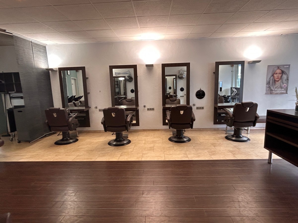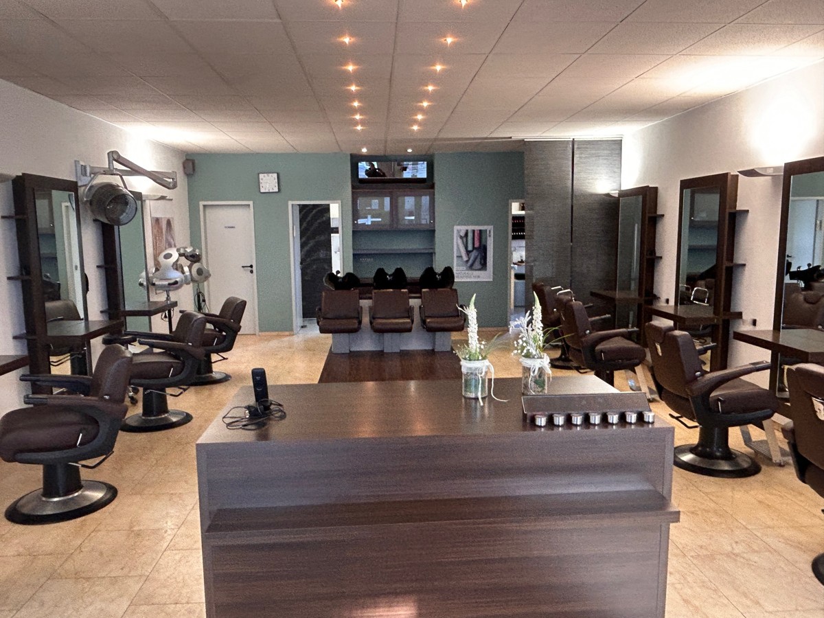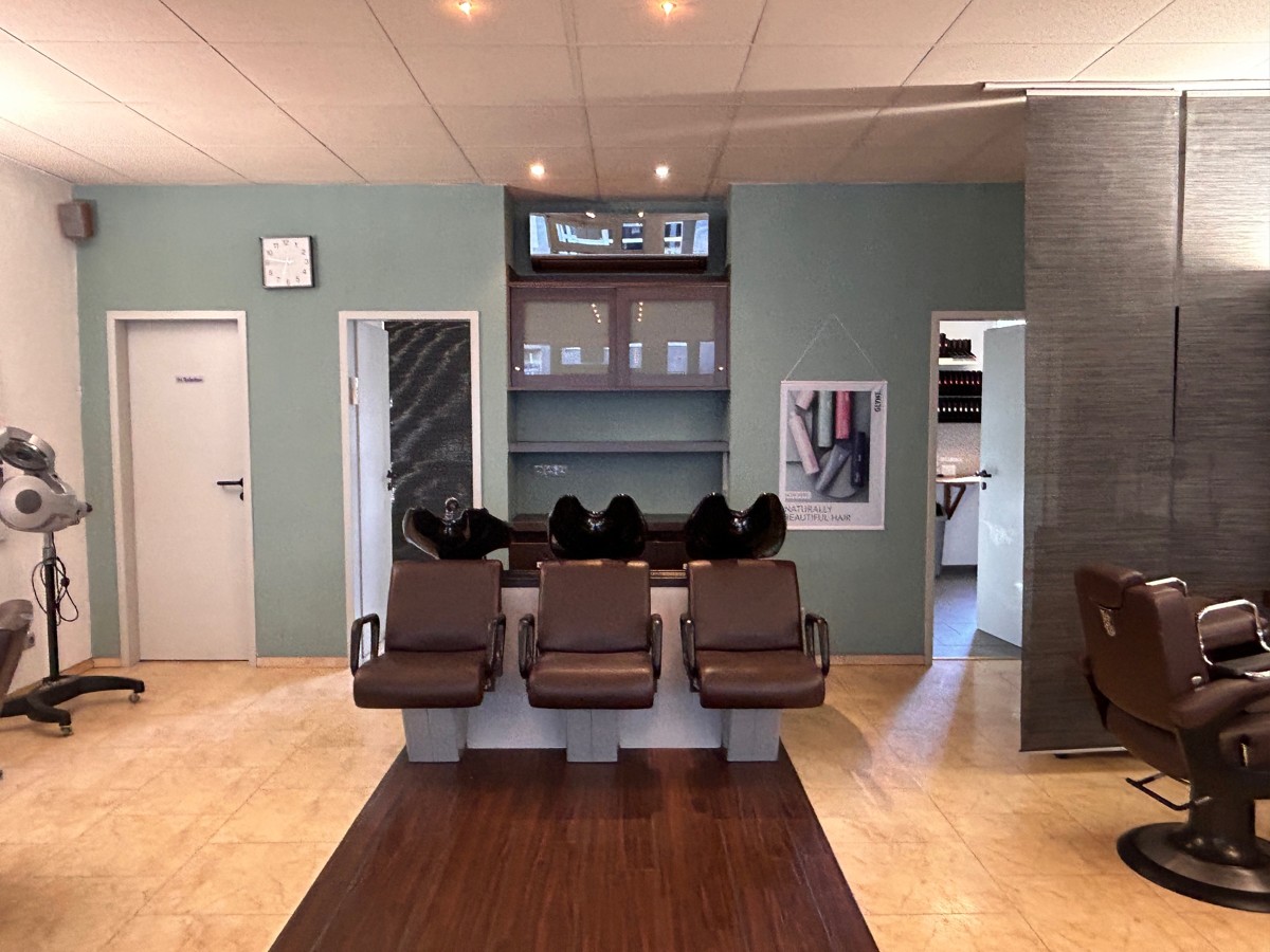 Die 90 qm große Gewerbefläche (Friseursalon) des 1986 erstellten Gebäudes beinhaltet den Friseursalon mit ca. 80 qm, 1 kleine Küche, ein Büro und ein WC. Außerdem gehören ein kleiner überdachter Außenbereich dazu.