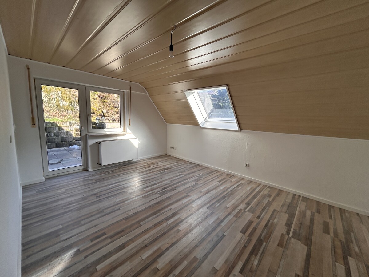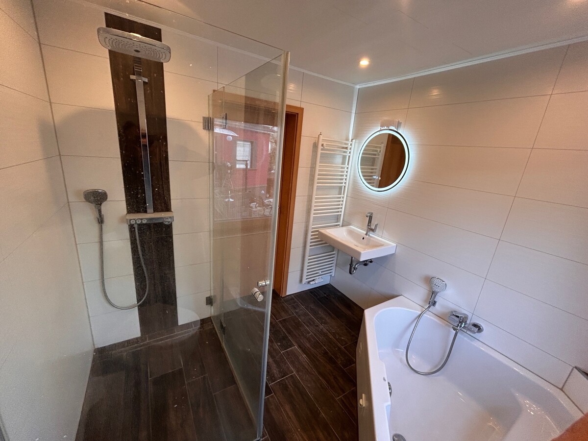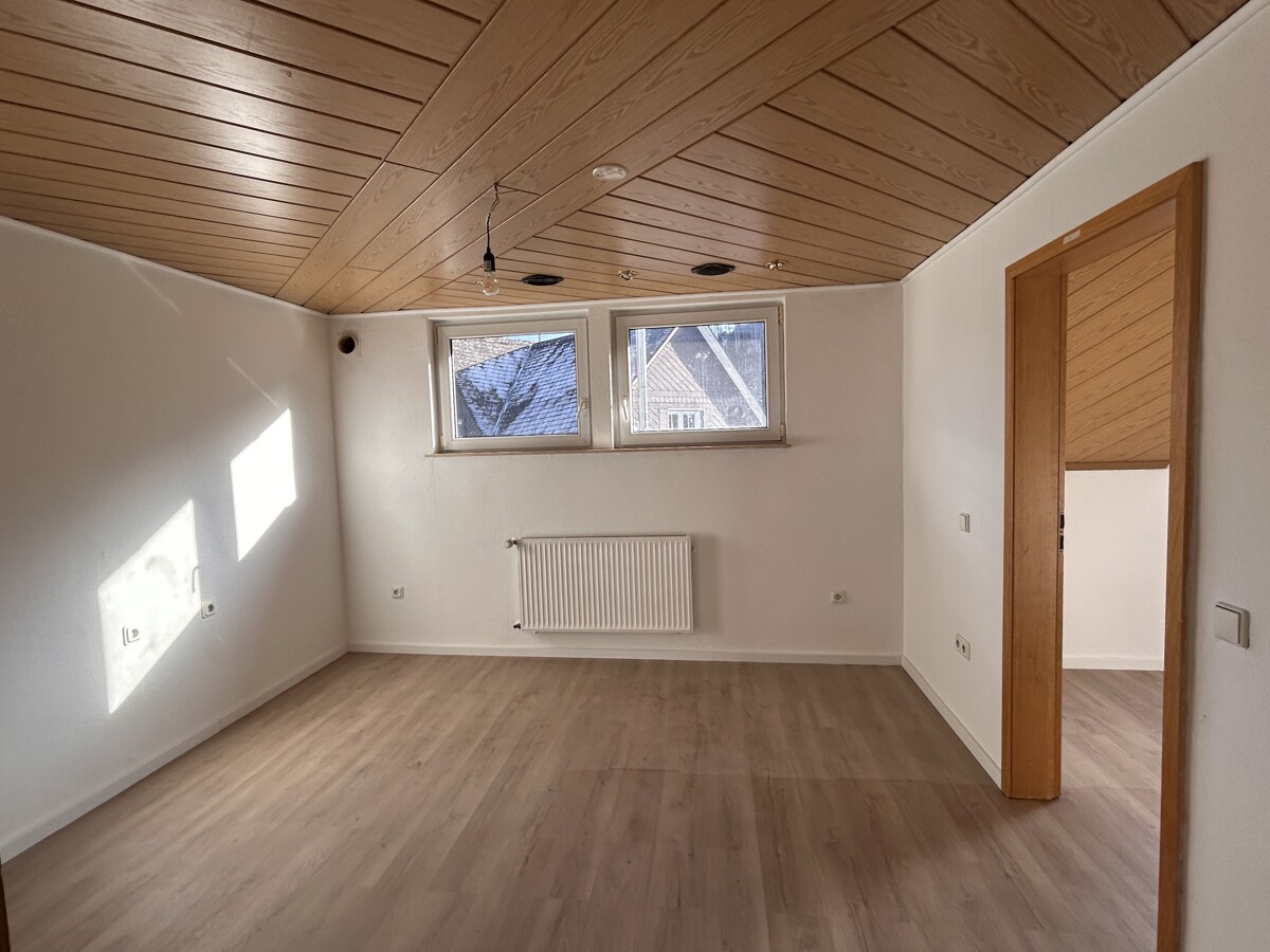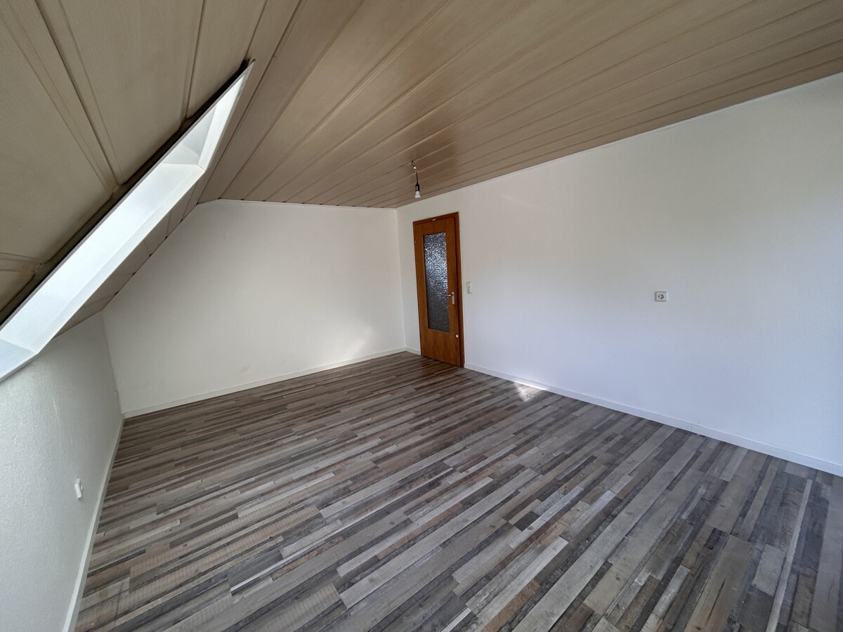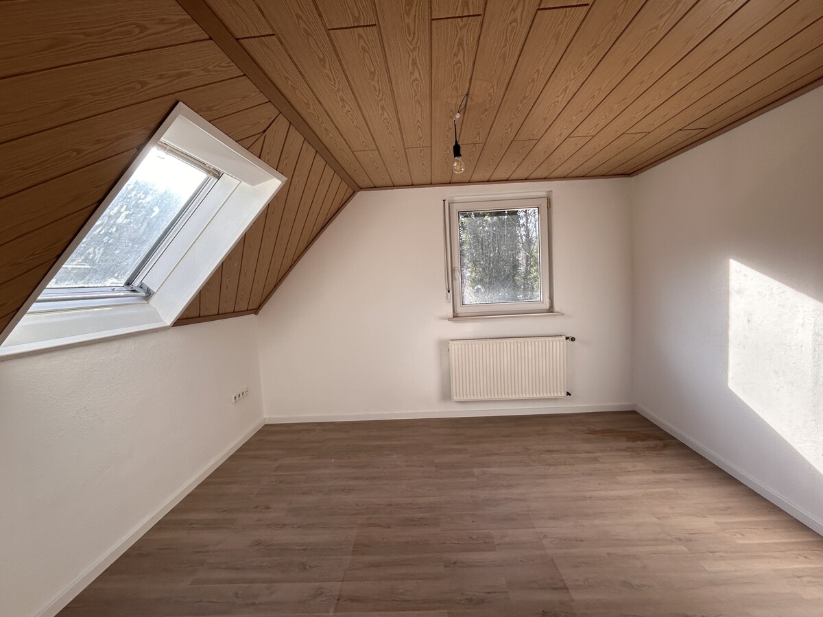 Im Erdgeschoss (ca. 63 qm Wohnfläche) befinden sich Küche, Wohn-, Esszimmer mit Ausgang auf eine Terrasse und ein neuwertiges Bad mit Dusche, Wanne und WC. Über eine schöne Holztreppe gelangen Sie in das Dachgeschoss (ca. 74 qm Wohnfläche), wo sich 5 Zimmer und ein erst 2026 fertiggestelltes Bad mit Dusche und WC befinden. Das Obergeschoss verfügt ebenfalls über eine Terrasse. Das Wohnhaus ist teilunterkellert und verfügt über einen Heizungskeller und großen Kellerraum.