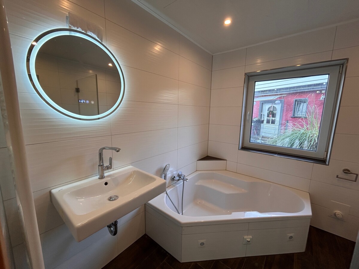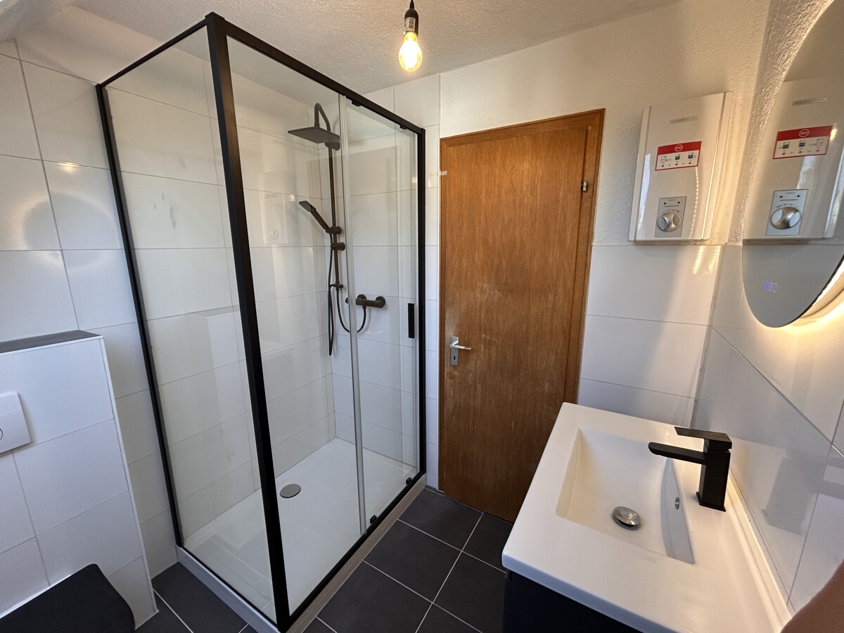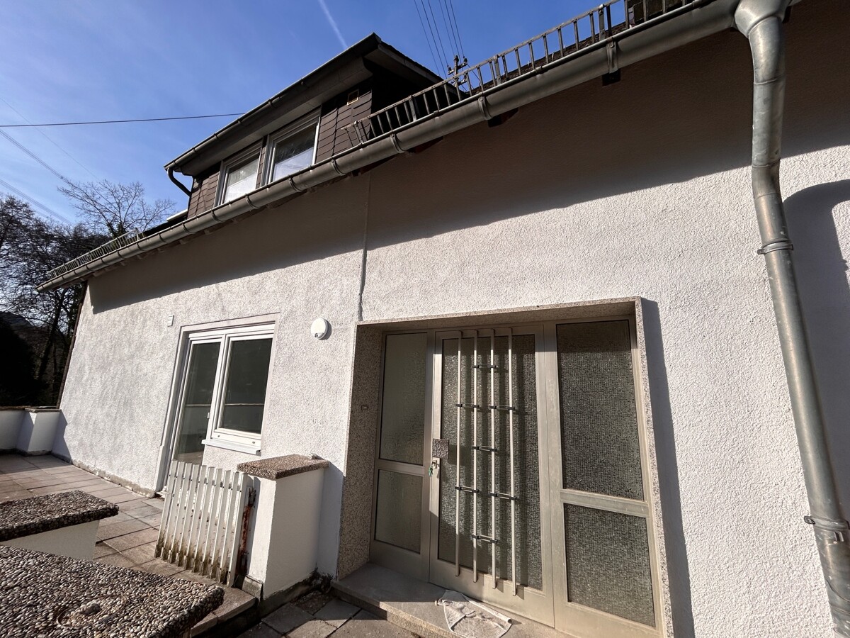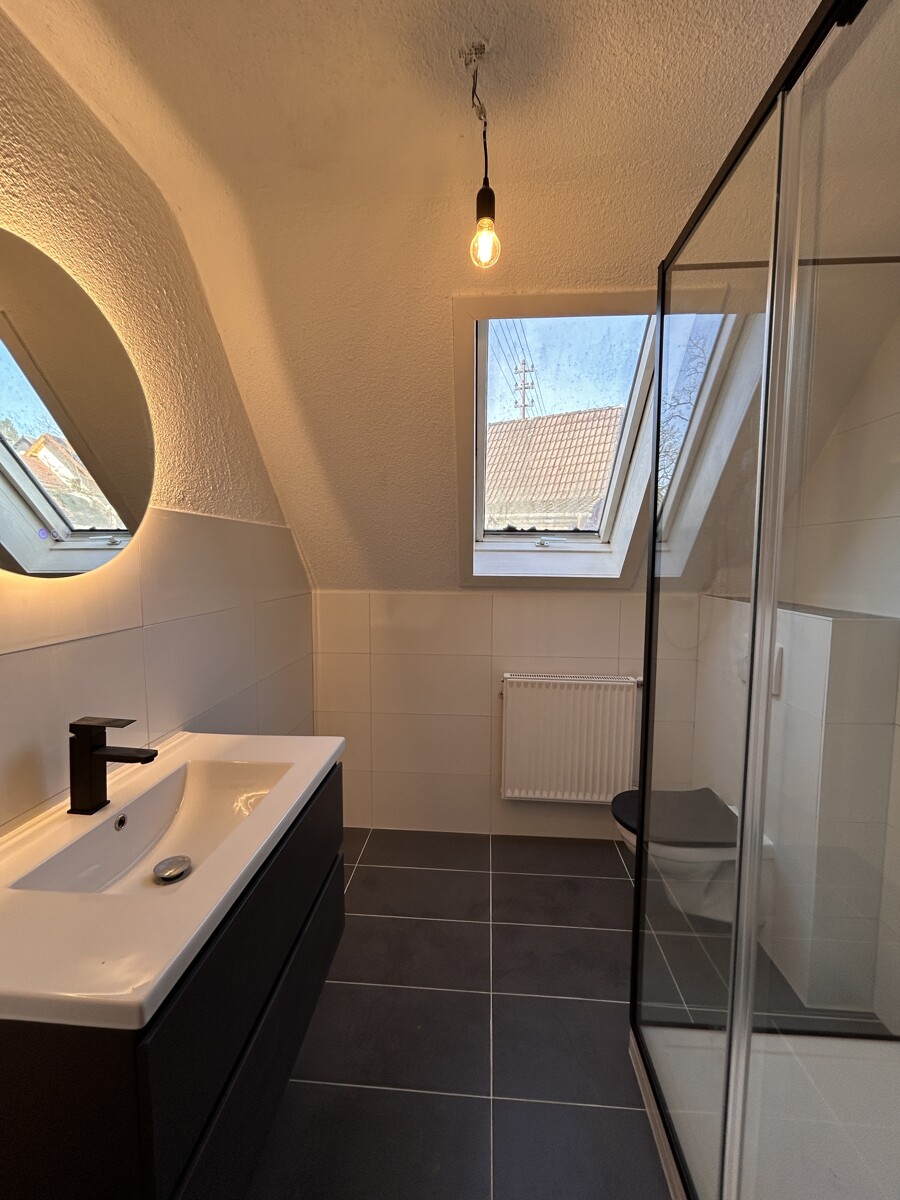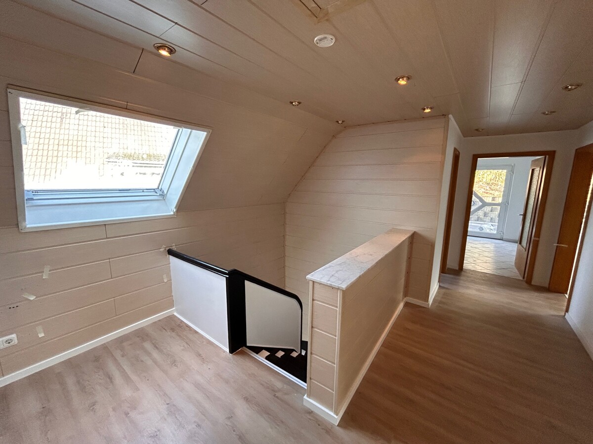 Im Erdgeschoss (ca. 63 qm Wohnfläche) befinden sich Küche, Wohn-, Esszimmer mit Ausgang auf eine Terrasse und ein neuwertiges Bad mit Dusche, Wanne und WC. Über eine schöne Holztreppe gelangen Sie in das Dachgeschoss (ca. 74 qm Wohnfläche), wo sich 5 Zimmer und ein erst 2026 fertiggestelltes Bad mit Dusche und WC befinden. Das Obergeschoss verfügt ebenfalls über eine Terrasse. Das Wohnhaus ist teilunterkellert und verfügt über einen Heizungskeller und großen Kellerraum.