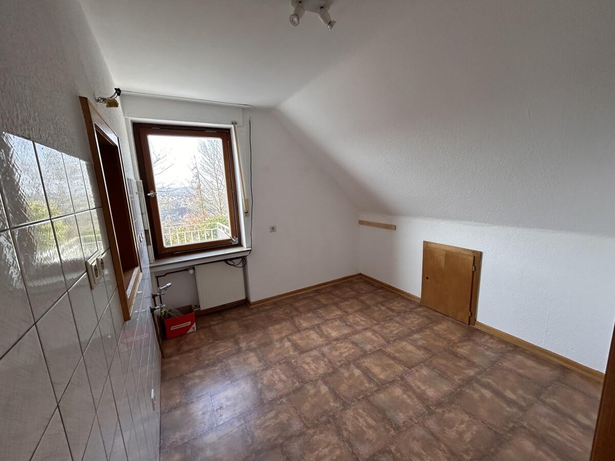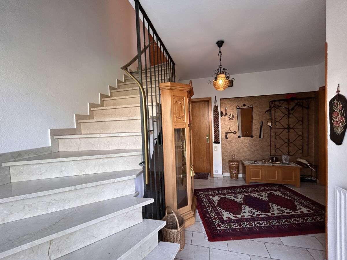 Im Erdgeschoss gelangen Sie über den Flur im Eingangsbereich in die Küche mit kleiner Sitzgelegenheit, ins Esszimmer und in das Wohnzimmer mit Ausgang auf den Balkon. Ebenfalls auf dieser Etage befinden sich ein Schlafzimmer, ein Kinderzimmer oder Büro und ein Bad mit Wanne, Dusche, WC und ein Gäste-WC. Über das helle Treppenhaus mit Marmortreppe gelangen Sie in das Obergeschoss. Dort befinden sich ein Schlafzimmer mit einem kleinen, angrenzenden Ankleidezimmer. Zusätzlich befindet sich auf dieser Etage noch eine abgeschlossene Dachgeschosswohnung mit Küche, Wohnzimmer mit Ausgang auf den Balkon, großes Schlafzimmer, ein Bad mit Wanne/WC und ein Gäste-WC. Ein großer Speicher bietet genug Stauraum. Das Haus ist voll unterkellert und verfügt über einen Heizungskeller mit Zugang zu einer Werkstatt und zur Doppelgarage sowie zwei Kellerräume. Ein extra hohes Carport bietet eine Unterstellmöglichkeit für ein Wohnmobil oder einen Wohnwagen.